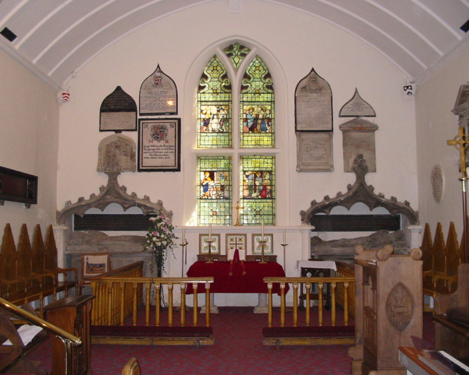 The ceiling of the chancel is ribbed and has flower-designed pendants and 4 angel corbels at each corner with the coat of arms of the Williams family. Above the East Window there is the Lamb and Flag symbol, whilst opposite this is a dragon (a symbol of Wales, or perhaps, a representation of evil overcome by the lamb)
