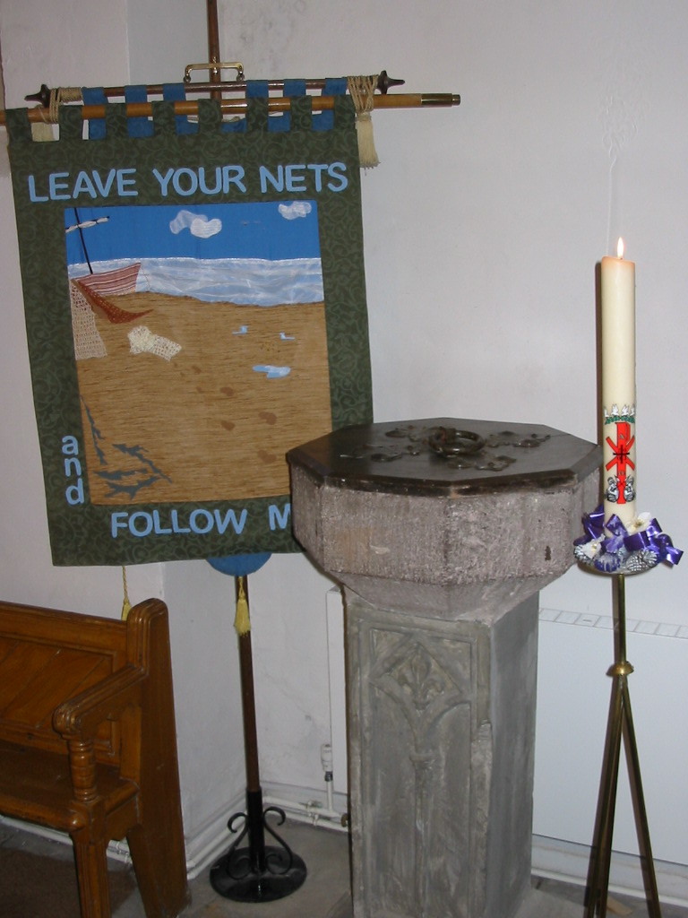 The stone font consists of a medieval font bowl mounted on a stone 'stem; (probably dating from 1840). The stone stem is particularly high and generally, the Vicar needs to use a platform to elevate himself in order to use the font safely. The font is used for baptism services for children and adults. Around this area, and near the chancel, the church is decorated by a number of banners made recently and over the years.
